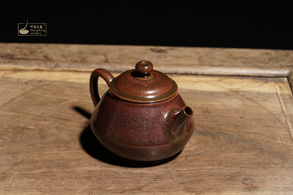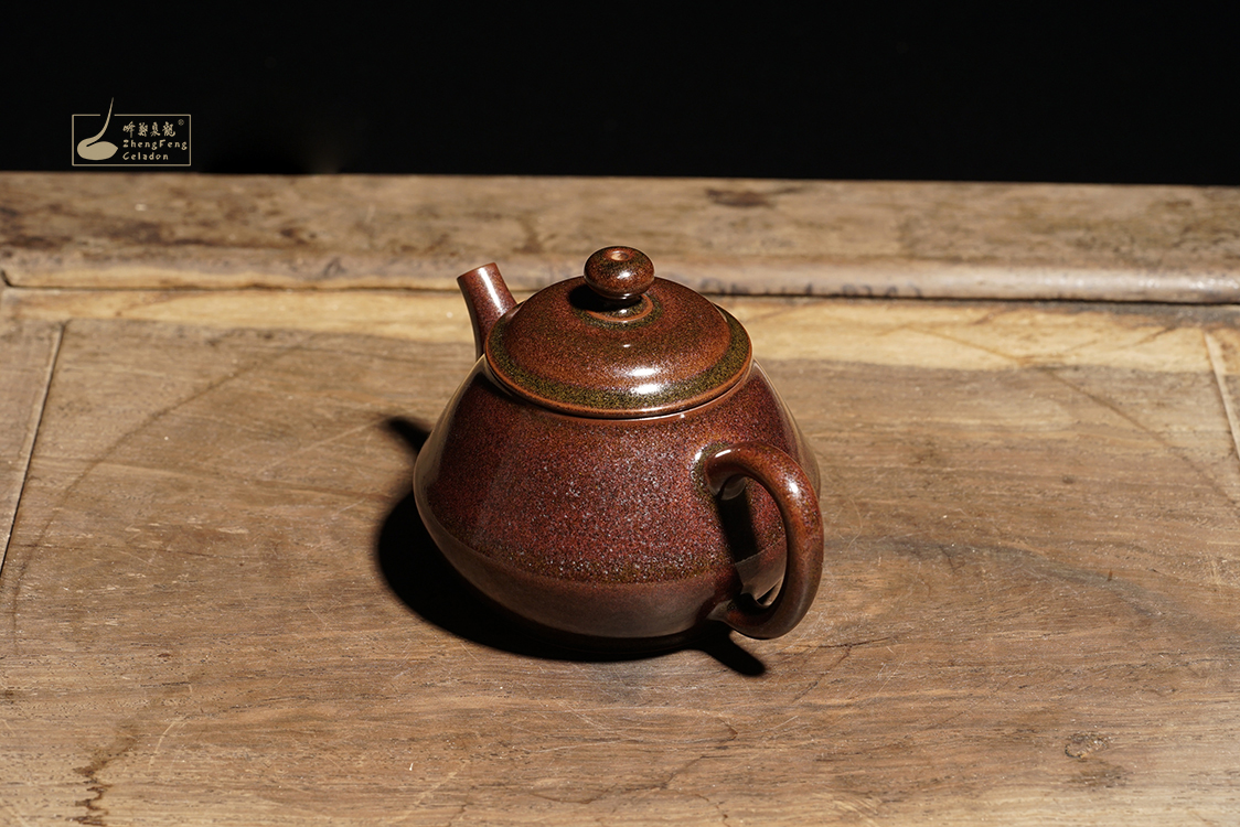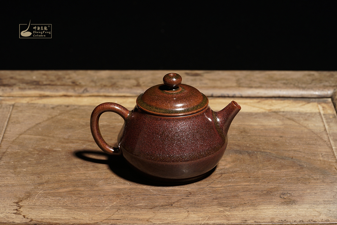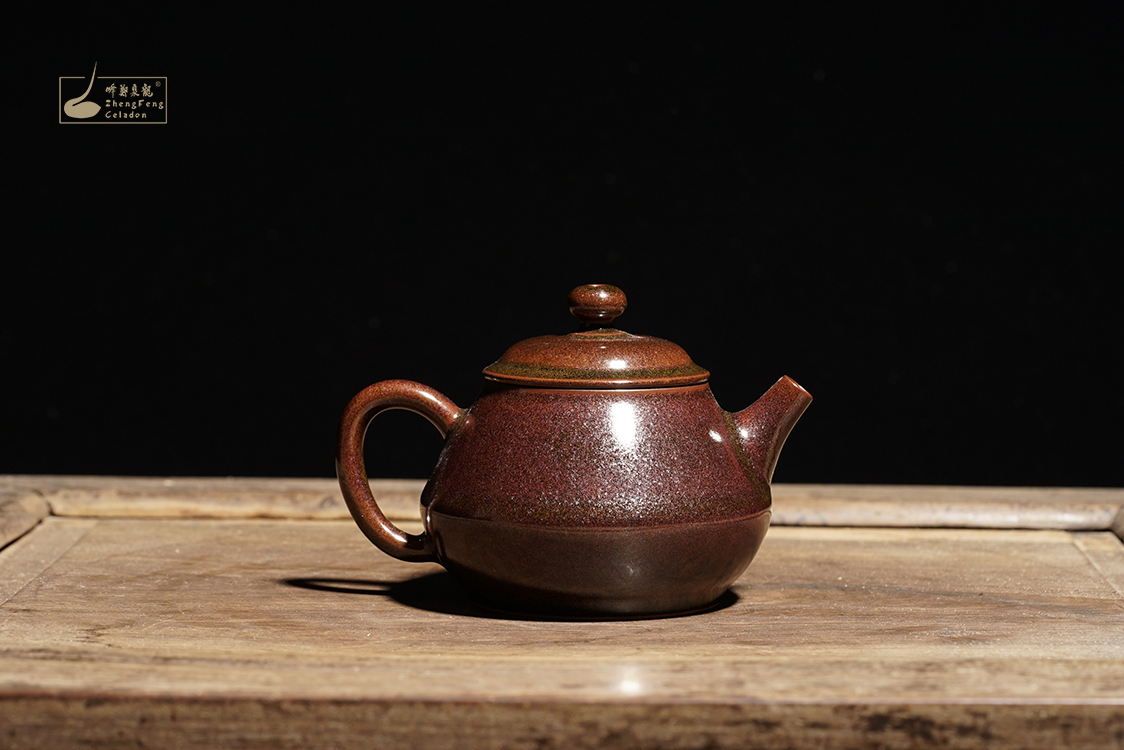 隕石天鐵——天枢壶(梨壶)原 料:龍泉瓷土、鑄劍天鐵 燒制溫度:1320℃制作工藝:手工制作 龍泉窯高溫燒制尺寸规格:长:约11厘米高:约7.5厘米口径:约4.7厘米底足:约5.5厘米容量:约150ml