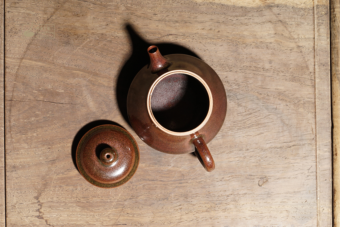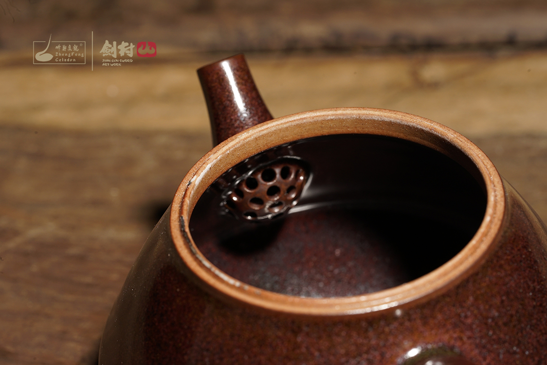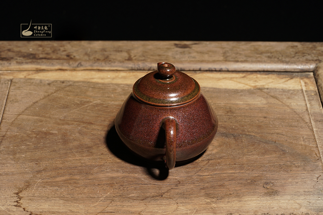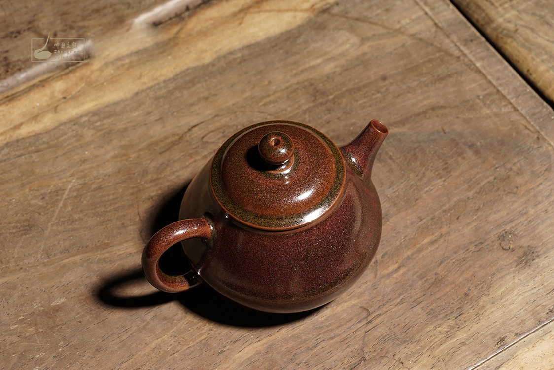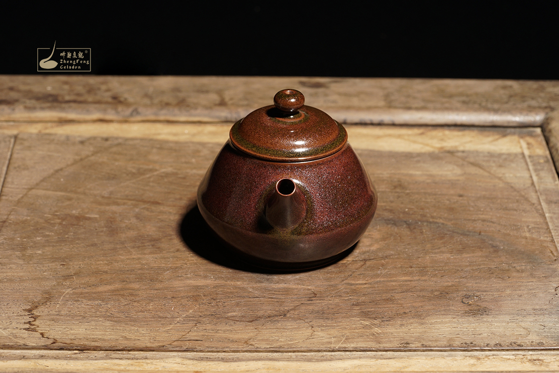 隕石天鐵——天枢壶(梨壶)原 料:龍泉瓷土、鑄劍天鐵 燒制溫度:1320℃制作工藝:手工制作 龍泉窯高溫燒制尺寸规格:长:约11厘米高:约7.5厘米口径:约4.7厘米底足:约5.5厘米容量:约150ml